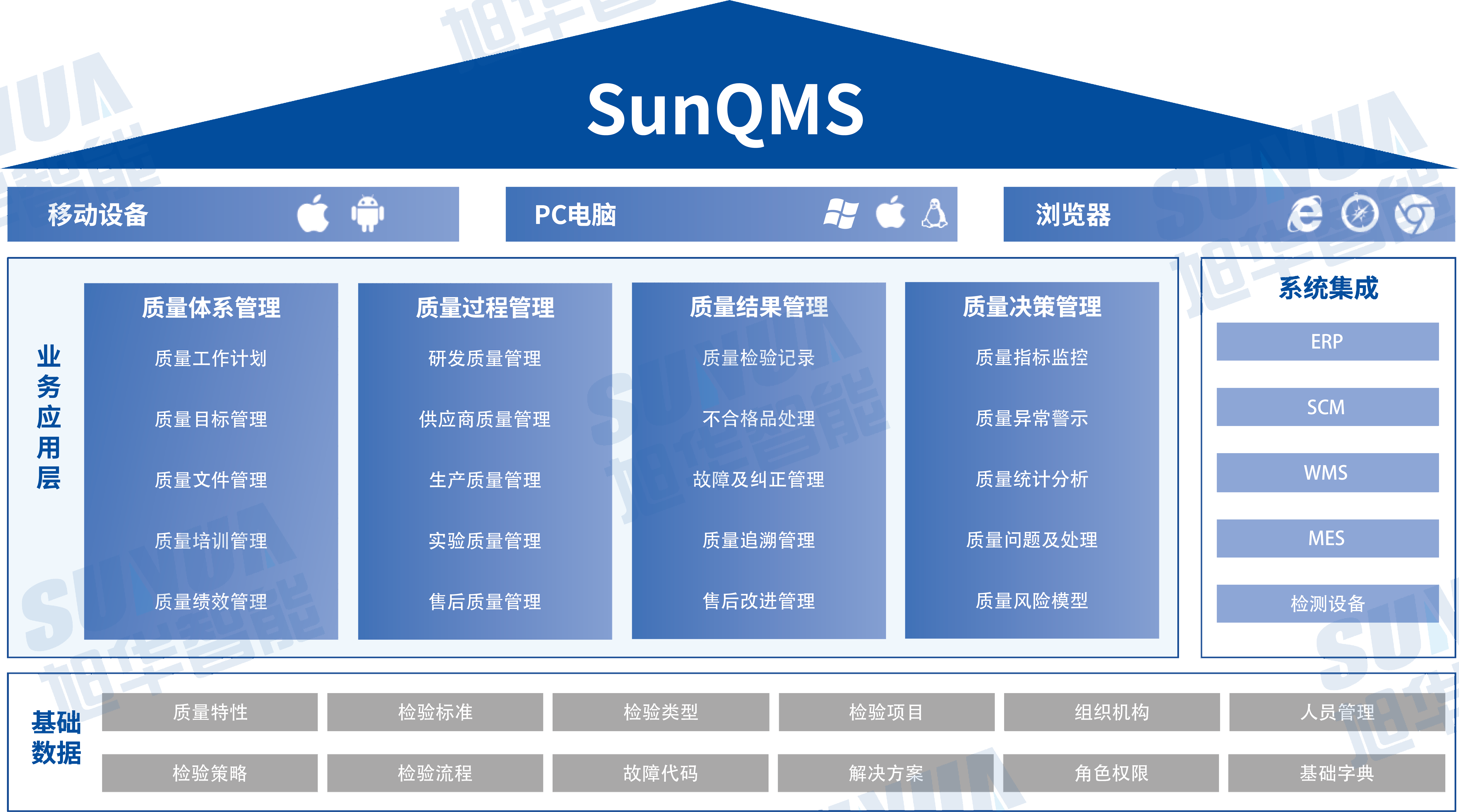 SunQMS质量管理系统功能主要包括质量体系管理、质量过程管理、质量结果管理、质量决策管理、质量综合看板、移动端应用等模块,且能够与MES、WMS、SCM、ERP、检测设备等系统集成,进行数据互联互通。